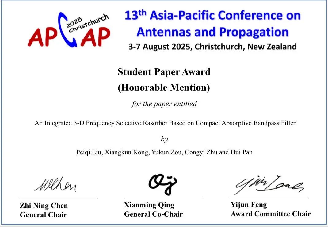 我院EMULab科研团队博士生获IEEE亚太天线与传播国际会议学生优秀论文奖